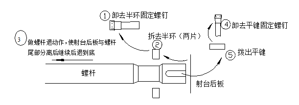 11、把螺桿向料筒前端移推出螺桿頭用活動扳手扳住螺桿尾部,用專用扳手扳下螺桿頭(注意:螺桿頭為左旋螺紋.)