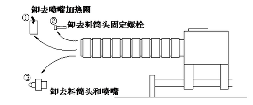 一、整套螺桿料筒組拆卸方法:(適用于大部份臥式注塑成型機)